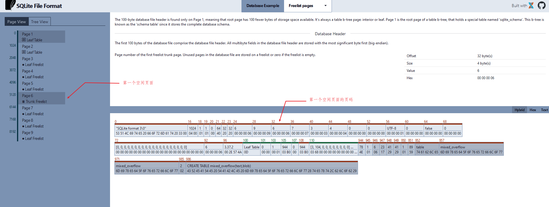 第一个空闲页面的编号存储在数据库头文件偏移量为 32 的地方,总的空闲页面数量存储在偏移量为 36 的这个地方.