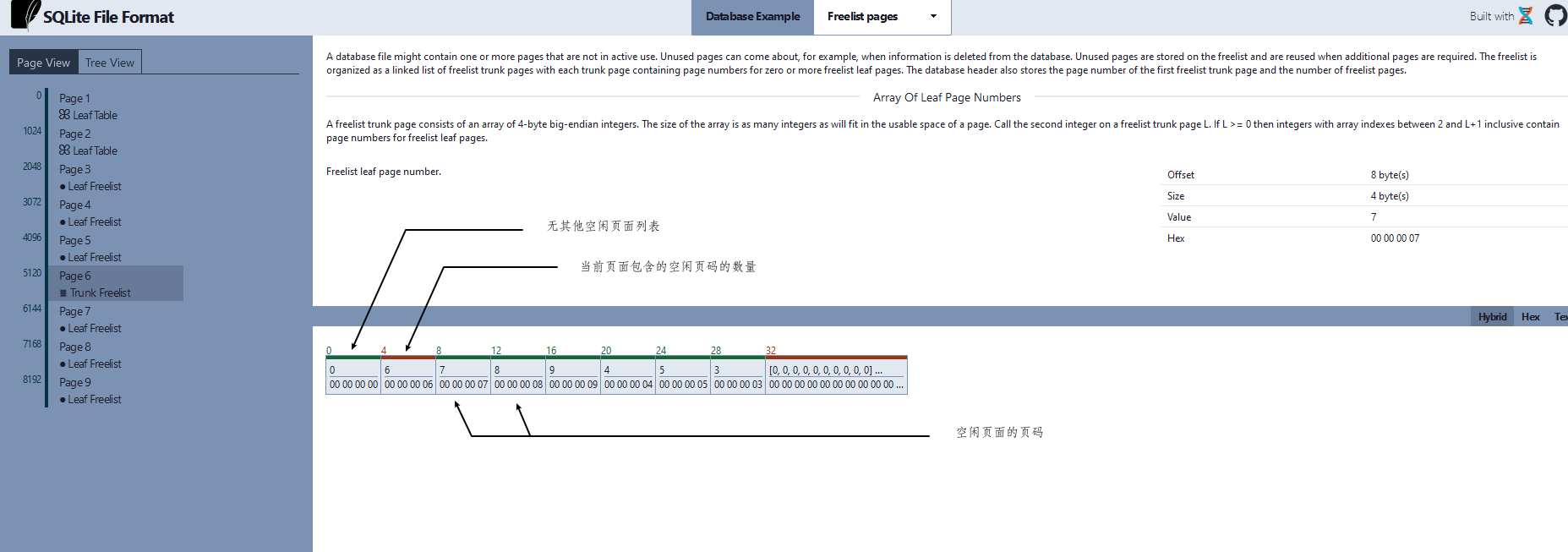 空闲页面由一个四字节大端序整数数组组成,其中第一个 4 字节是下一个空闲页面的页面,如果这是最后一个空闲页面,则数组第一个值为 0, 第二个 4 字节是当前空闲页面记录的空闲页面的个数,后续的 4 字节数也是空闲页面的页码.